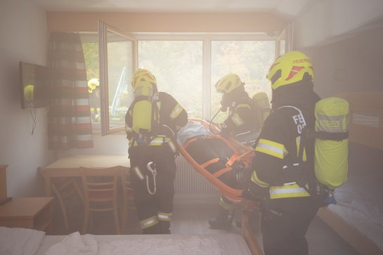 Angenommen wurde ein Brand in den Schlafräumen, mit mehreren verletzten und vermissten Personen. Im Einsatz waren die FF Obertraun, die FF Bad Goisern mit dem Atemschutzfahrzeug, die FF Eselsbach-Unterkainisch mit dem Drehleiterfahrzeug sowie das Rote Kreuz Bad Goisern. Nach erfolgter Lageerkundung wurden insgesamt 4 Atemschutztrupps eingesetzt, um die Löscharbeiten durchzuführen und die Personen aus dem Gebäude zu retten. Außerhalb des Gebäudes wurde die Wasserversorgung hergestellt. Ersthelfer vom Feuerwehr-Medizinischen-Dienst unterstützen das Rote Kreuz bei der Versorgung der Verletzten. Mehrere Personen konnten mit der Drehleiter aus dem Gebäude gerettet werden.